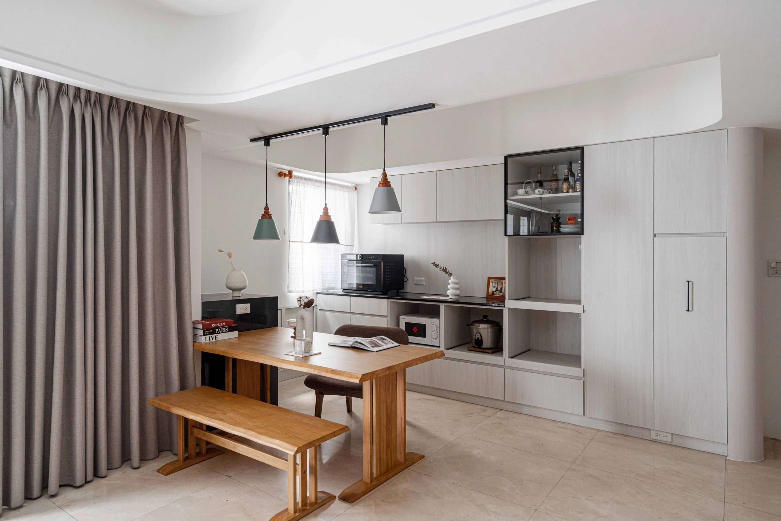 以簡約為底,讓細節成為生活的溫度。 本案以「自然溫潤」為核心語彙,透過大地色系、柔和線條與材質層次,形塑出安定且放鬆的居家氛圍。圓弧天花串聯客餐廳動線,使空間視覺更流暢、通透。