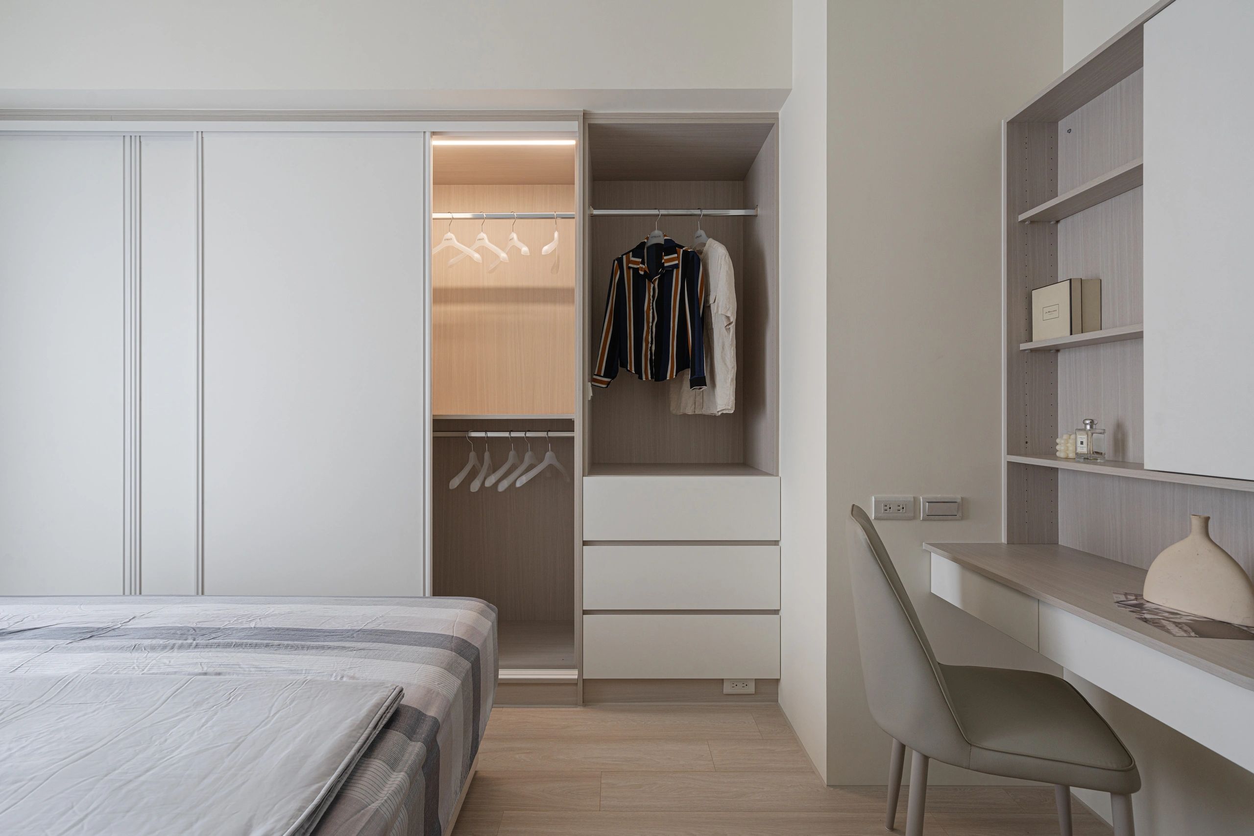 在這個空間裡,我們以灰、白、木三種色調作為主軸,運用不同材質的對比,讓整體調性明亮柔和卻不單調。牆面選用司曼特塗料,搭配織品窗簾與布質沙發,在光影變化中展現豐富層次。 櫃體線條銜接簡潔俐落,加入圓弧及燈條元素柔化結構, 同時擁有造型及收納,整體空間設計處處都貼心。