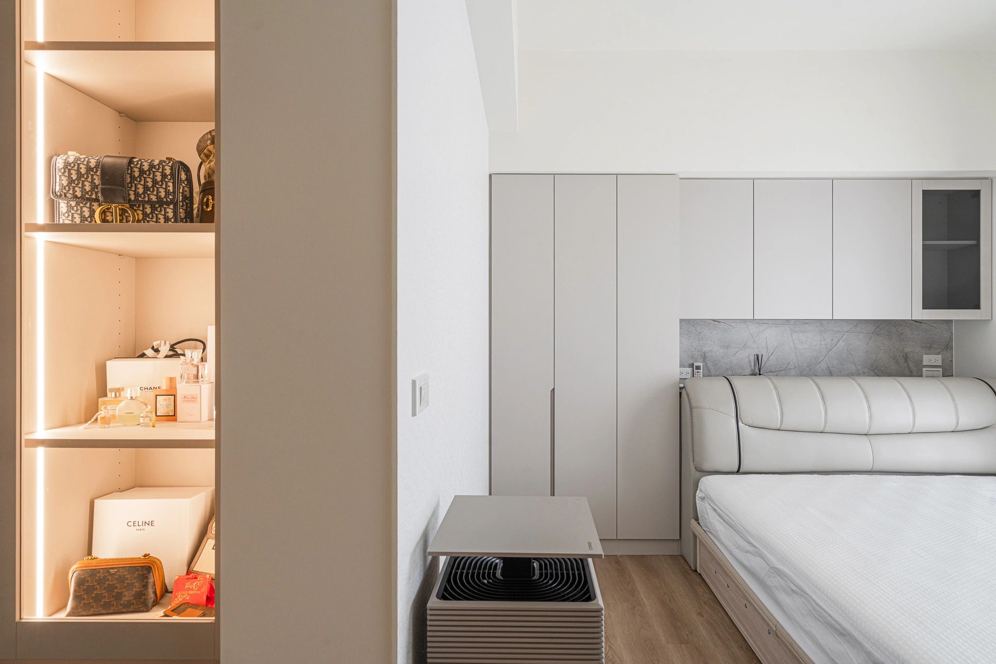 全室大量運用間接照明,柔化空間氛圍,為日常增添光影層次。其中化妝台櫃體以擁有優雅線框的杜板門設計,實現屋主對法式風化妝間的嚮往。材質運用上融合人造石、灰玻、霧面烤漆、木皮與弧形語彙,達成協調且層次豐富的空間語言。