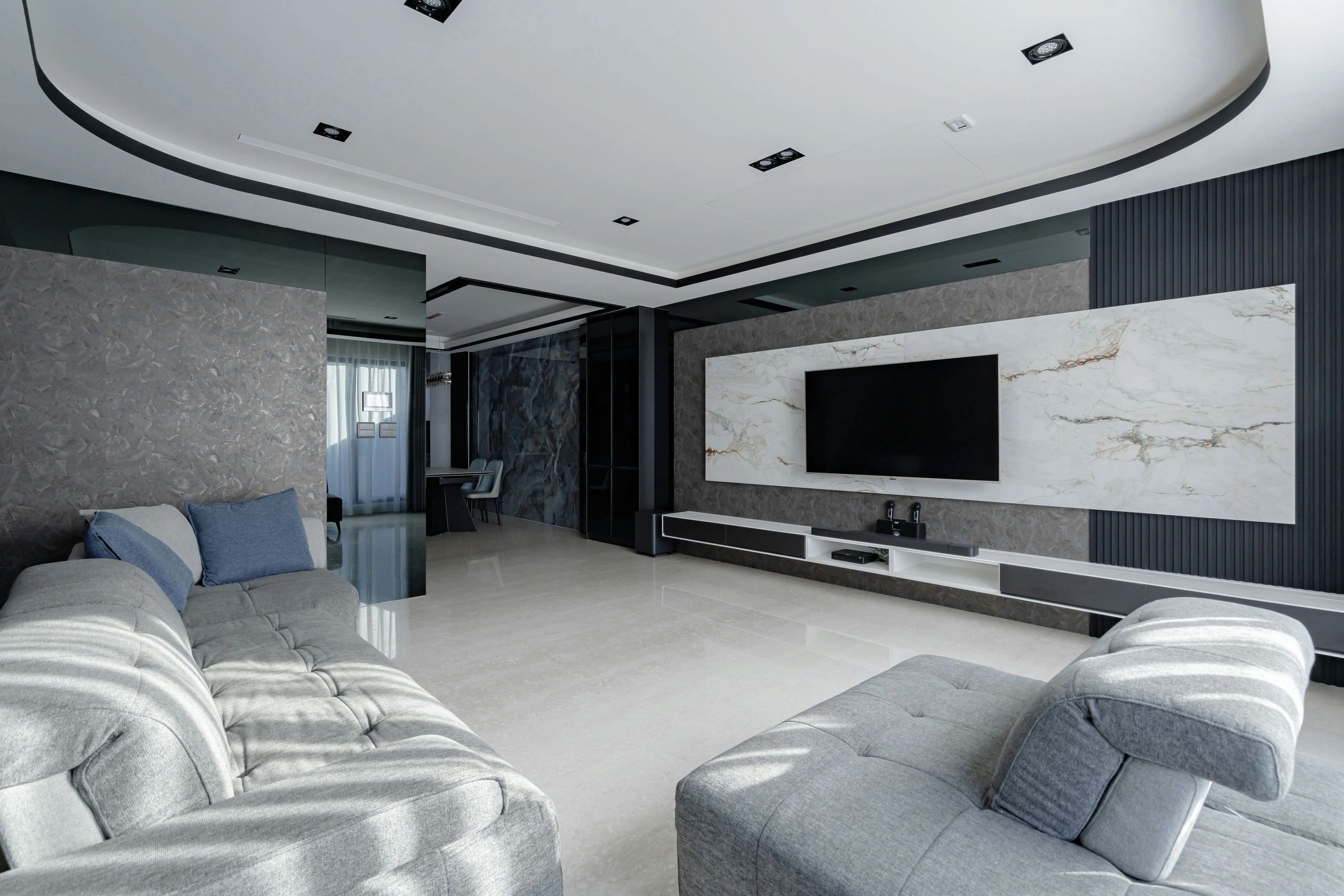 以黑灰色為主調,陽光灑入譜出愜意感,電視牆選用白色大理石紋路薄板,搭佐鐵件和黑鏡設計,營造精緻細膩的氛圍感,側邊的收納玻璃櫃則以黑玻來展示屋主珍藏的酒類,整體材質透過燈光展現不同的居家樣貌,增添柔和感。